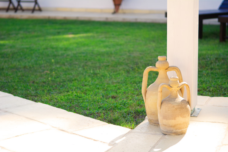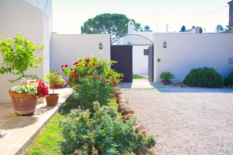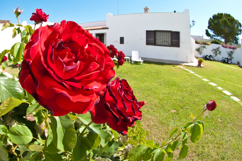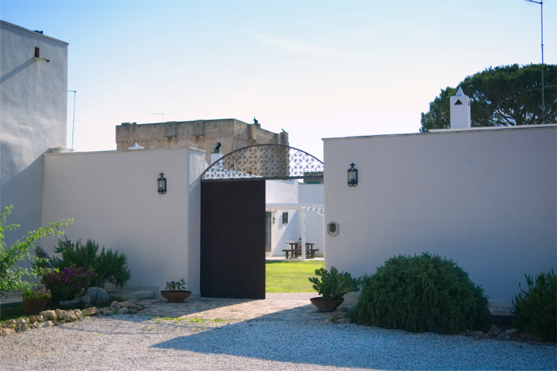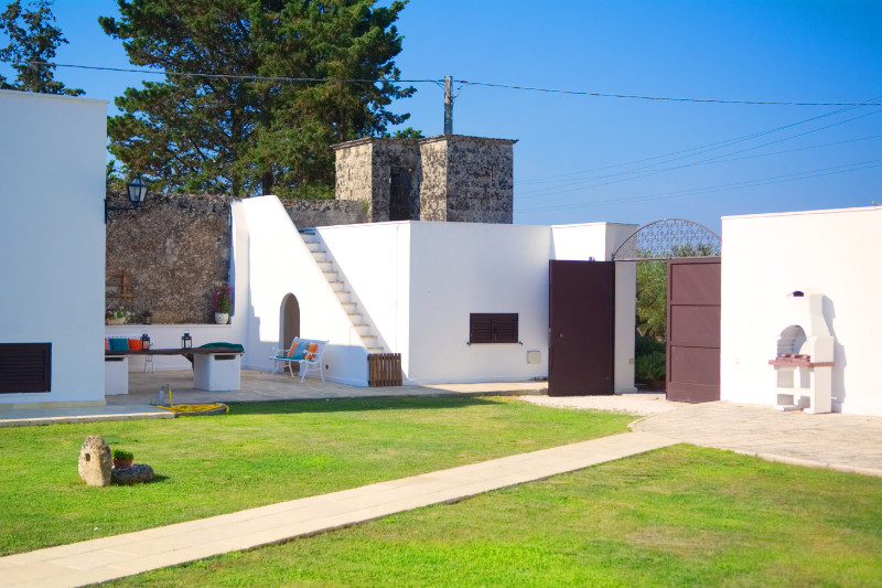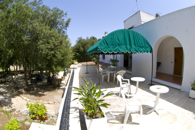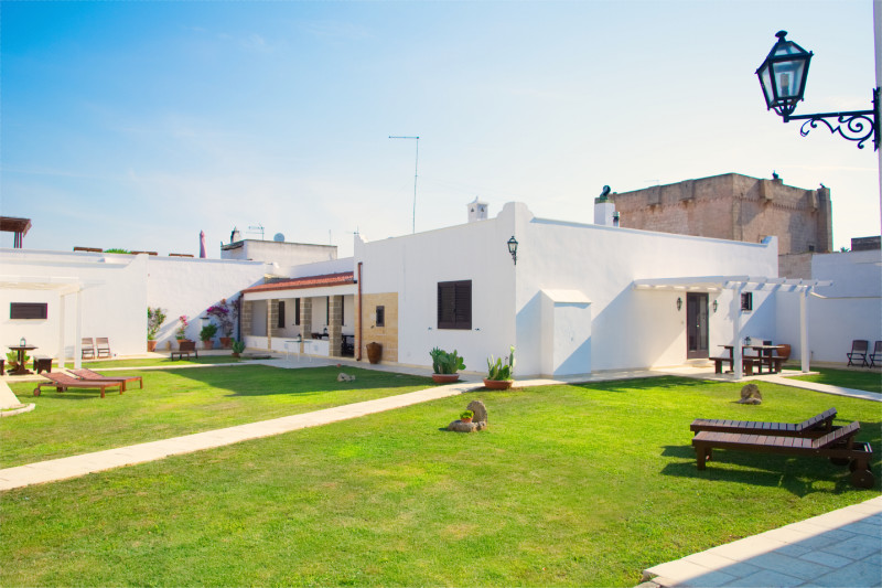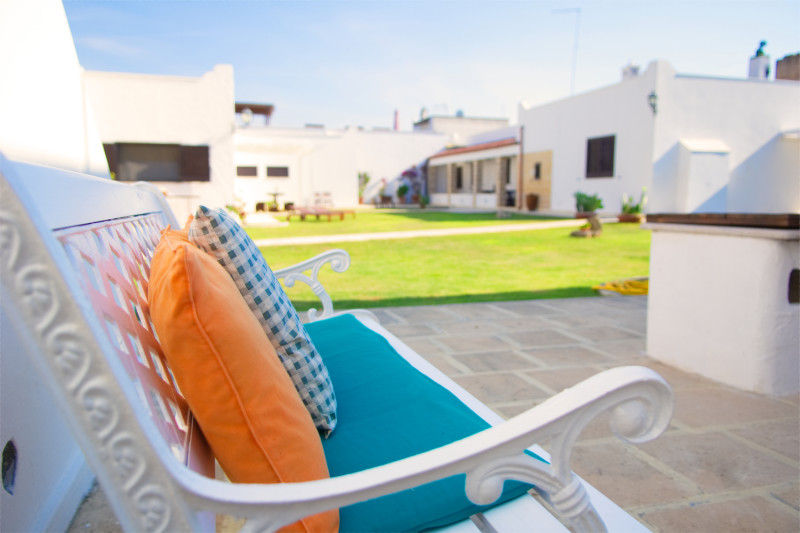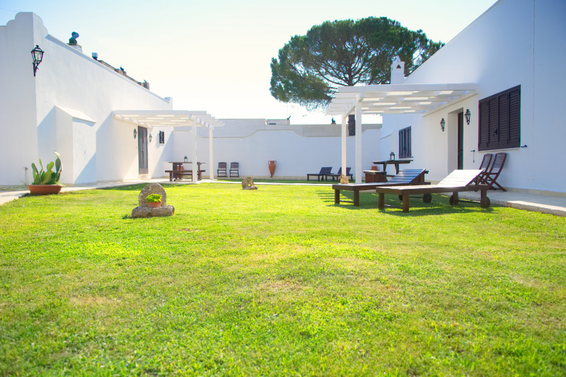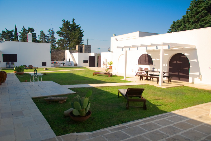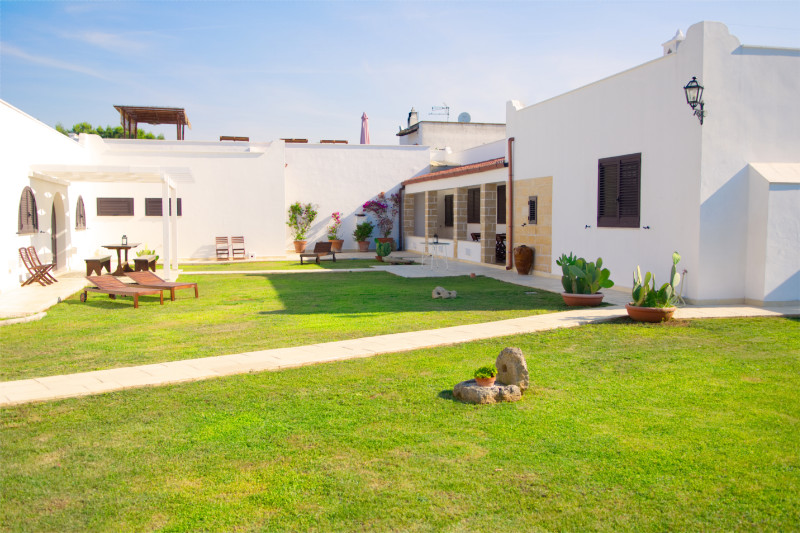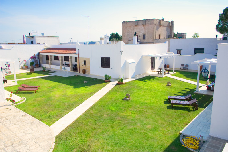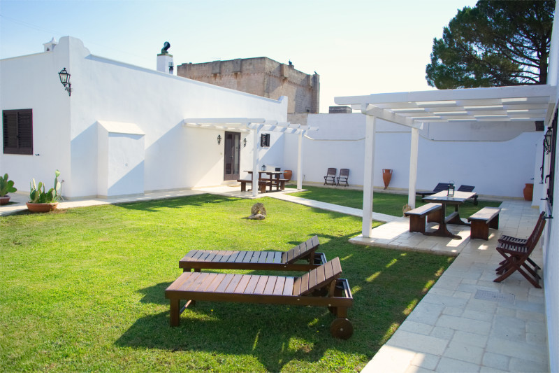 Di seguito alcune immagini della corte interna della Masseria. Su un curatissimo prato all'inglese, gli spazi di pertinenza degli appartamenti e delle camere, sono attrezzati con lettini, sedie, tavoli e ombrelloni offrendo la possibilità di pranzare e cenare o semplicemente prendere il sole.