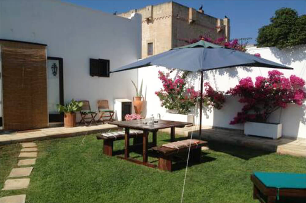 Entrata indipendente dal giardino della corte, la sua superficie di 100 mq è così distribuita: ingresso con salottino tv e guardaroba, ambiente giorno con cucina e soggiorno/living tv. Due camere da letto, di cui un'ampia matrimoniale con zona ricreativa, l'altra più piccola con letti a castello per bambini. Due bagni. Subito fuori l'ingresso, presso il giardino della corte, questo alloggio offre un suo patio con un ampio "gazebo arredato" per la cena. Il giardino riserva comodi lettini per il relax ed angolini "segreti" comodamente arredati per chiacchierare sotto le stelle oltre ad una sala giochi per grandi e piccini e l'immancabile "Area Barbecue".