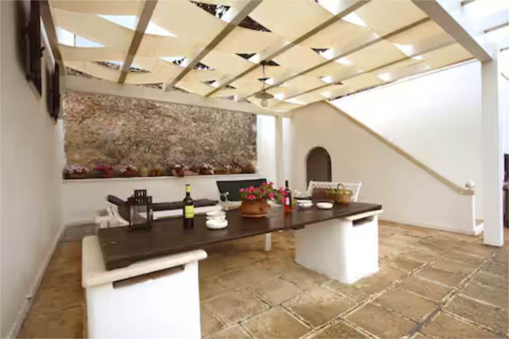 Villa Le Stalle si mostra subito in tutta la sua ampiezza e comodità con un enorme "open space" arredato in zona soggiorno e zona pranzo. Entrata indipendente dal "giardino della corte" si rivela una dimora fresca e spaziosa, così distribuita: ambiente unico arredato in zona pranzo e cucina ed in zona divani e tv. A seguire due camere matrimoniali con affacci sul giardino, due ampi bagni più un antibagno. Subito fuori l’ingresso nel giardino della Corte, Villa Le Stalle offre un suo patio con un ampio gazebo arredato per la cena. Il giardino riserva comodi lettini per il relax ed angolini "segreti" comodamente arredati per chiacchierare sotto le stelle oltre ad una sala giochi per grandi e piccini e l'immancabile "Area Barbecue".